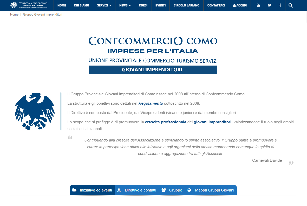 Il Gruppo Provinciale Giovani Imprenditori di Como nasce nel 2008 all’interno di Confcommercio Como. La struttura e gli obiettivi sono dettati nel Regolamento Il Direttivo è composto dal Presidente, dai Vicepresidenti e dai membri consiglieri. Lo scopo che si prefigge è di promuovere la crescita professionale dei giovani imprenditori, valorizzandone il ruolo negli ambiti sociali e istituzionali. |